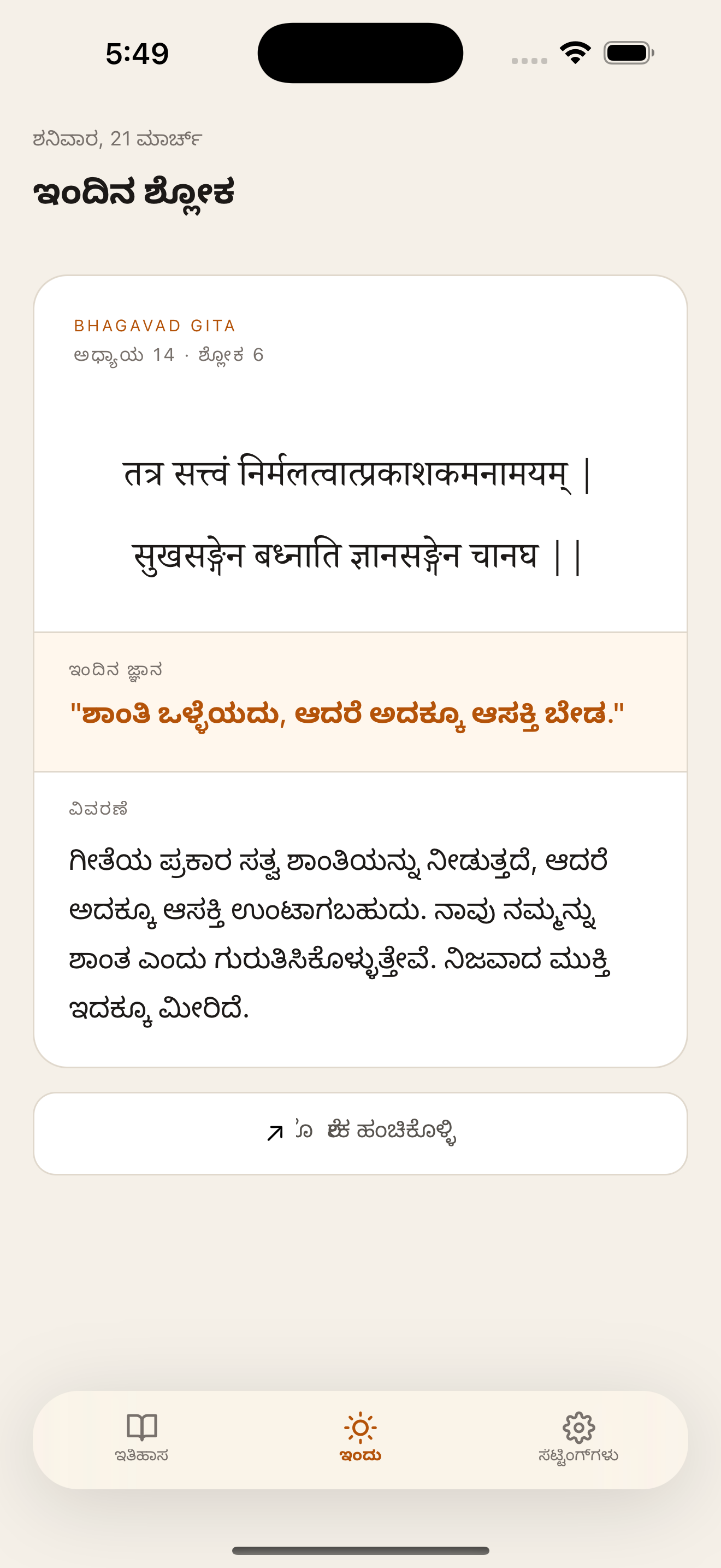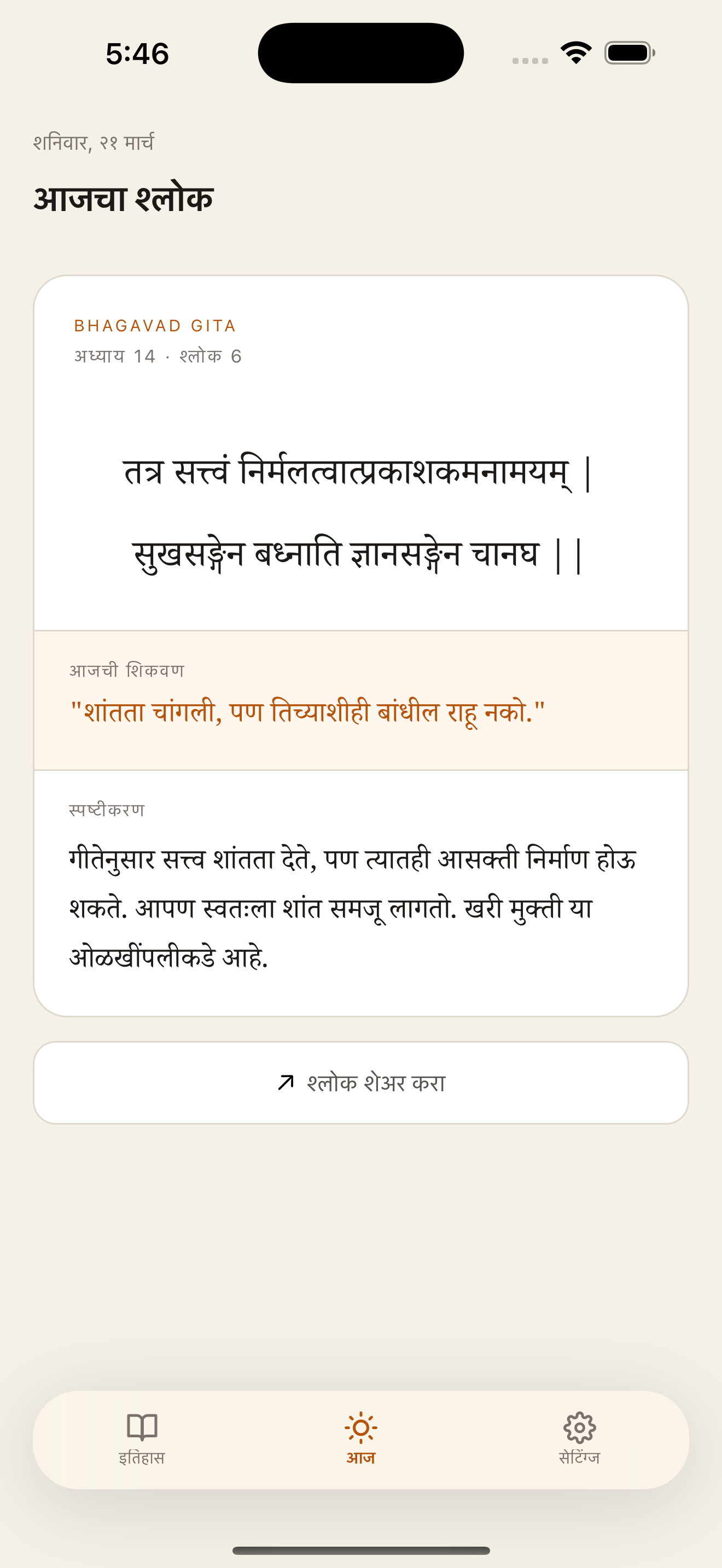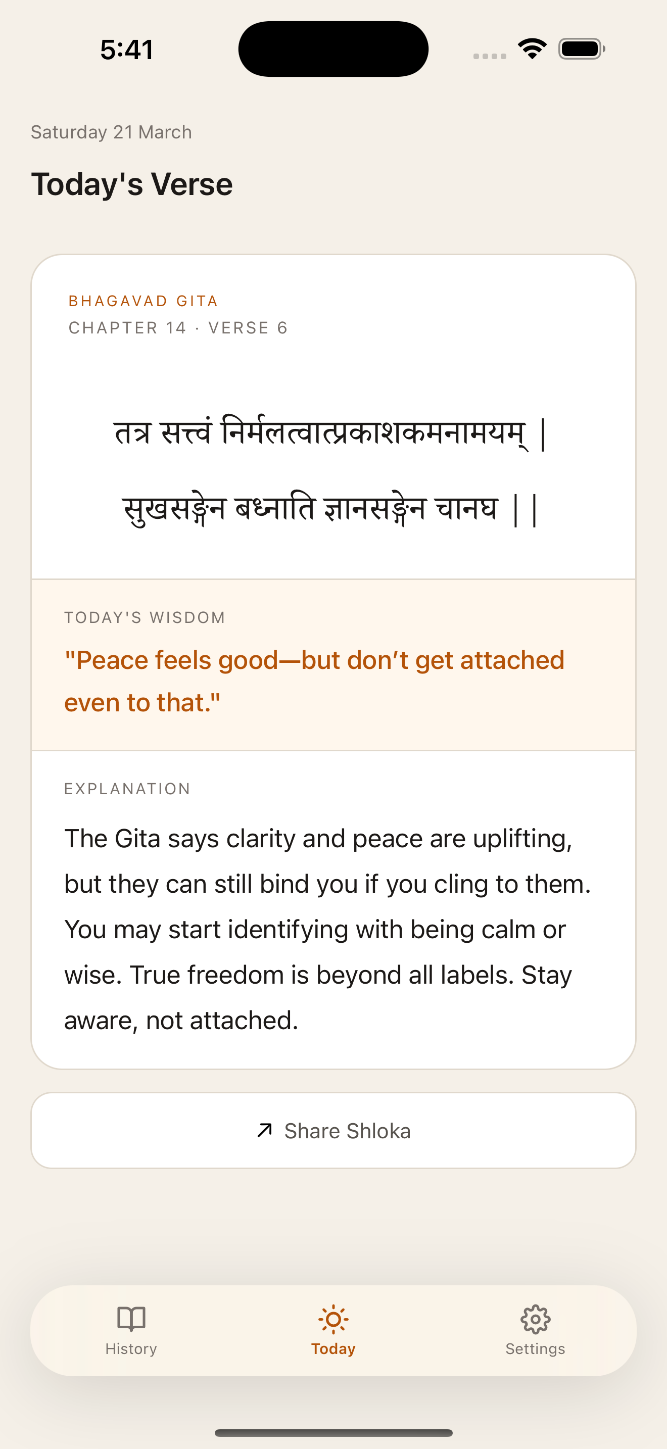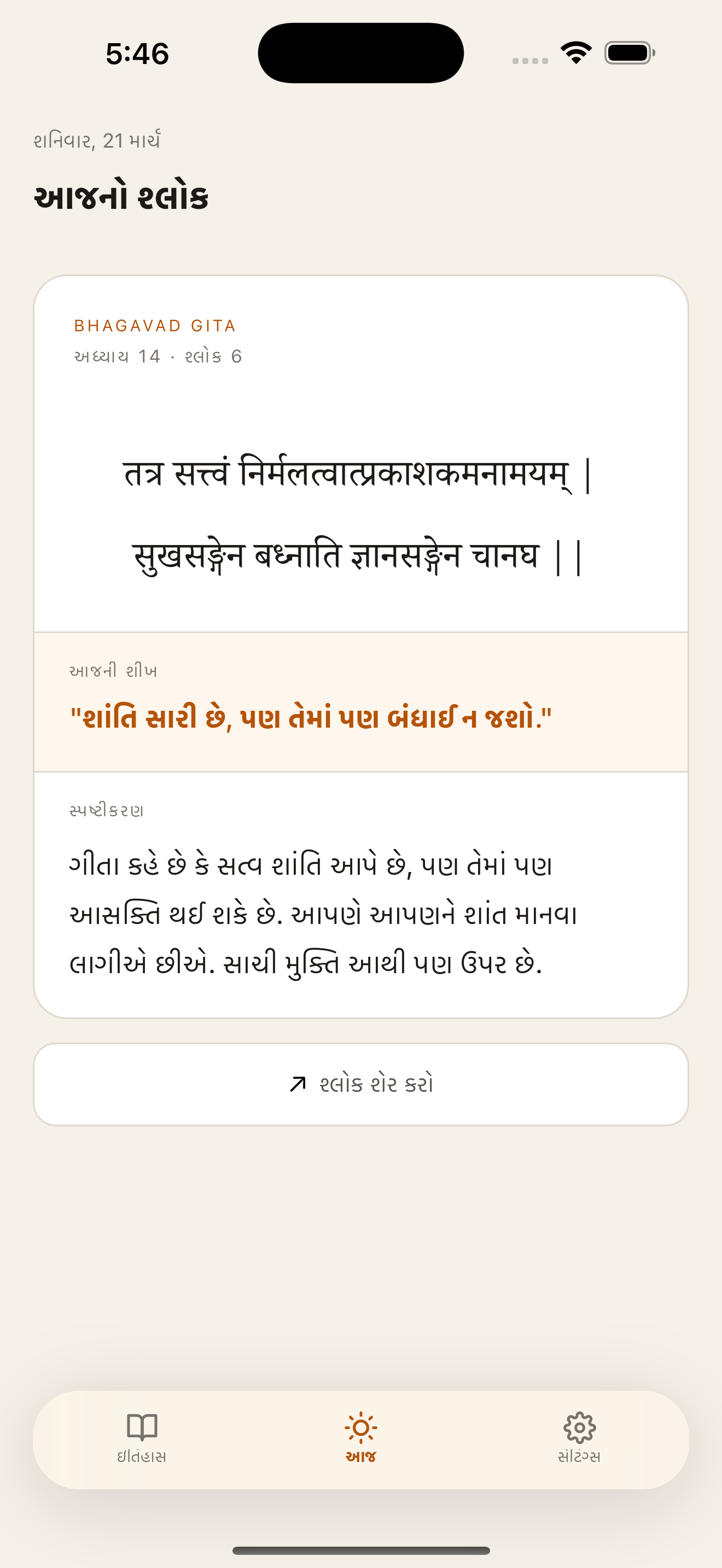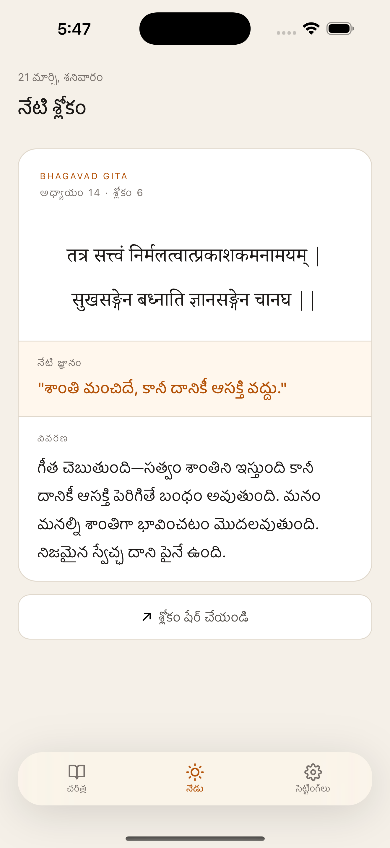 Each shloka comes with a one-liner and a full explanation in your own language.