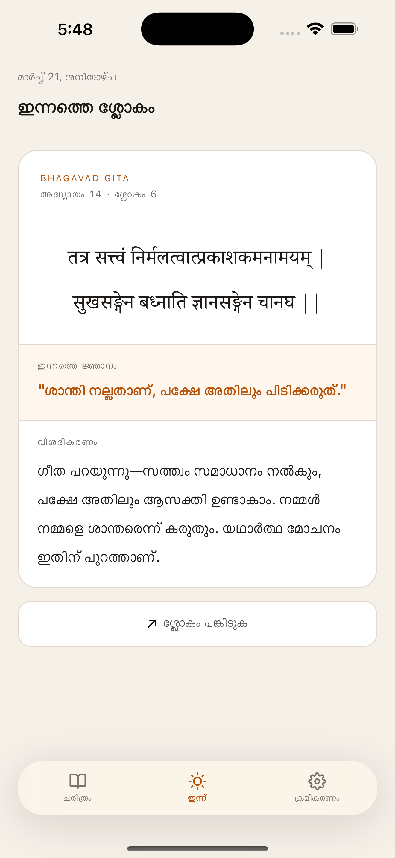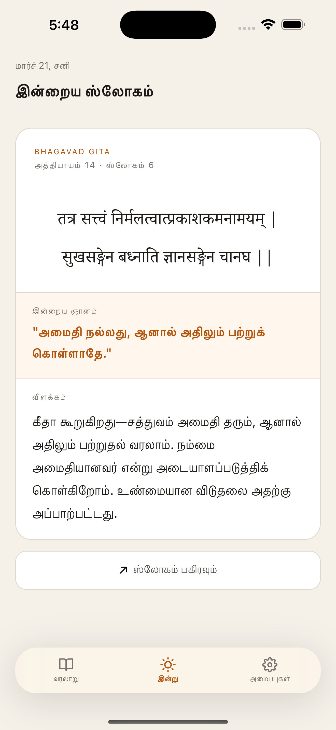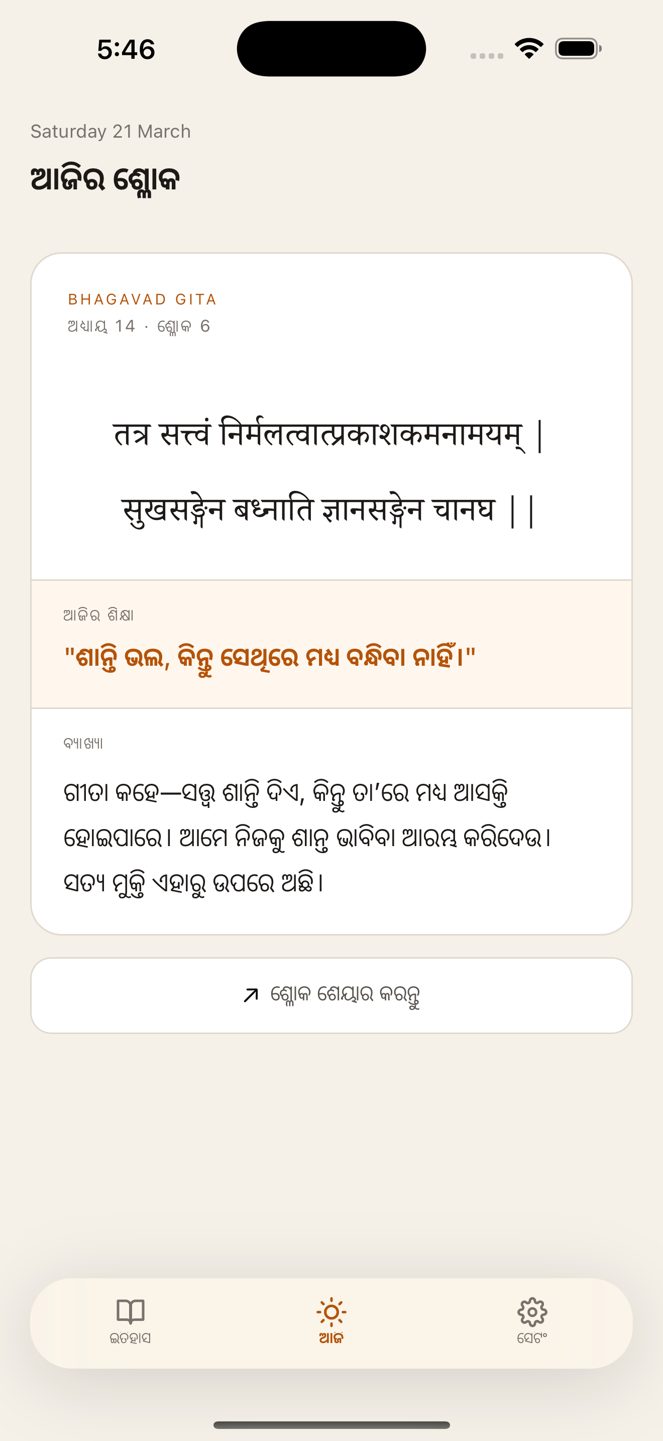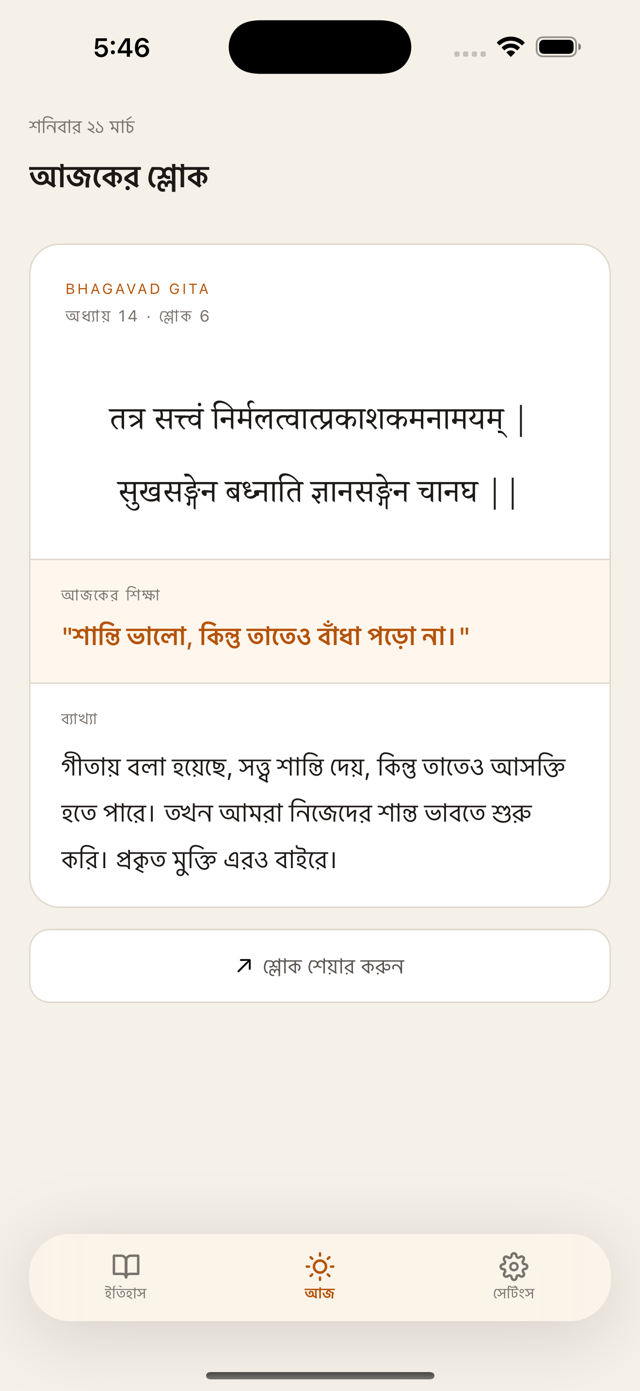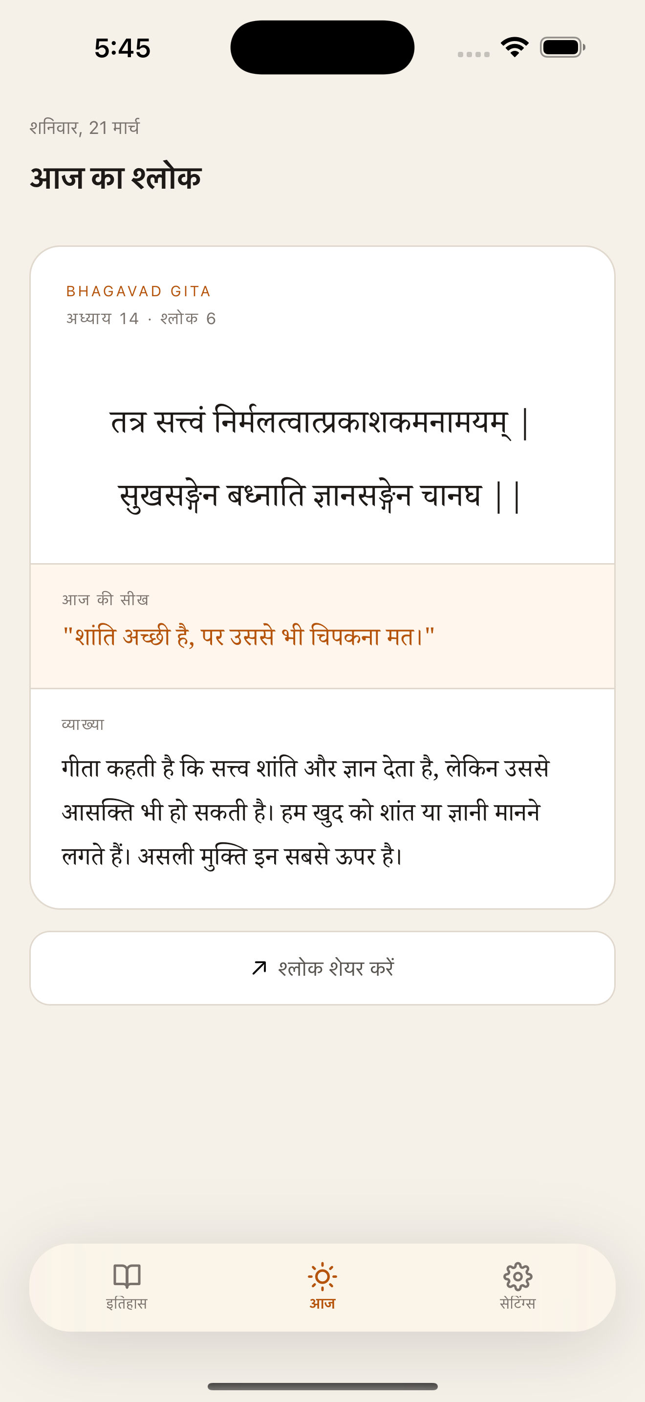 Each shloka comes with a one-liner and a full explanation in your own language.